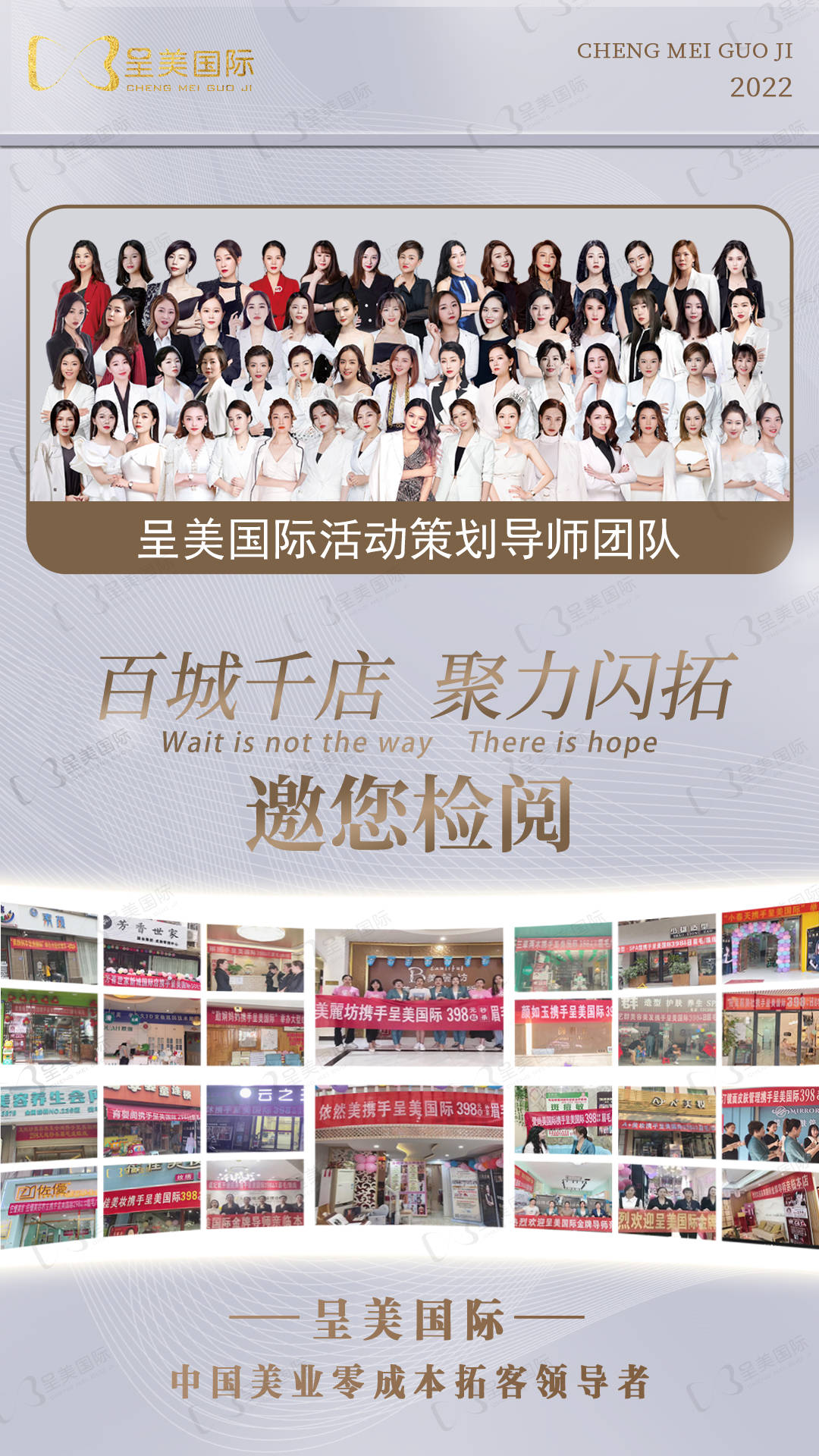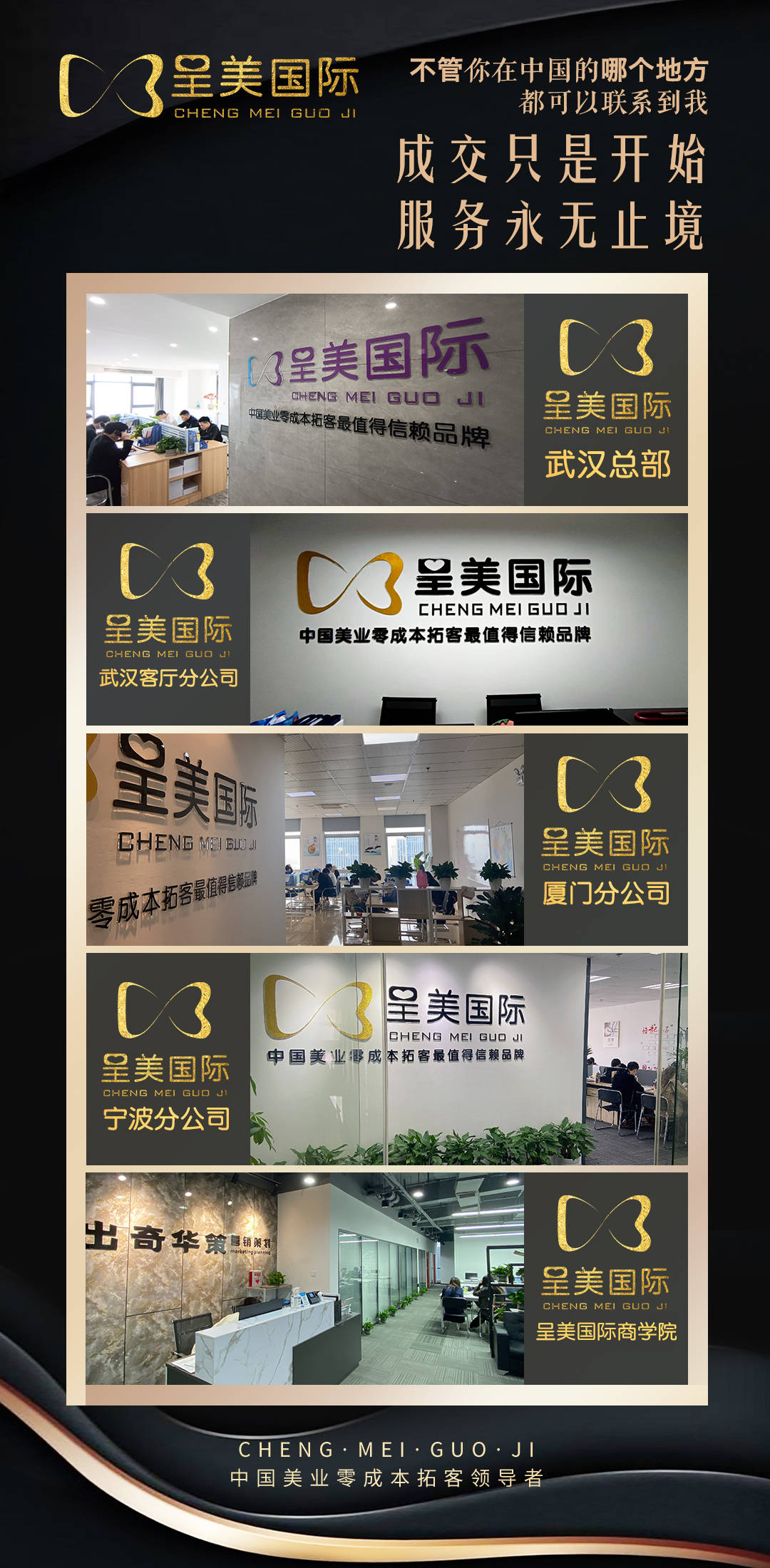 呈美国际荟萃业内精英,先后成立武汉客厅呈美国际分公司,厦门呈美国际分公司,宁波呈美国际分个公司,武汉商学院。专门设有运营部、销售部、设计部、客服部、培训部,旗下拥有专业的美业拓客专家千余人,美业全案策划老师100余名,地推执行专家300余名,美业人才培训专家40位,专业的美业人才达到2000余人。呈美国际帮助全国26000多家客户提高店内客流量、增加业绩,拓客场次已达到60万余次。合作店面遍布全国各地!
